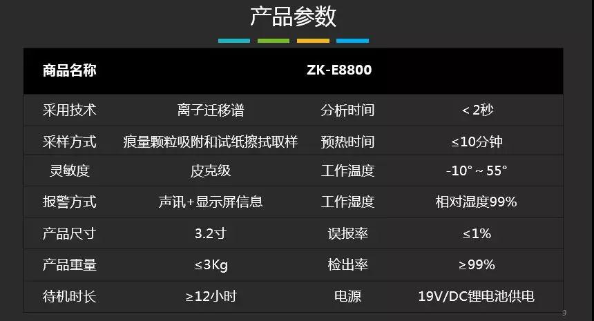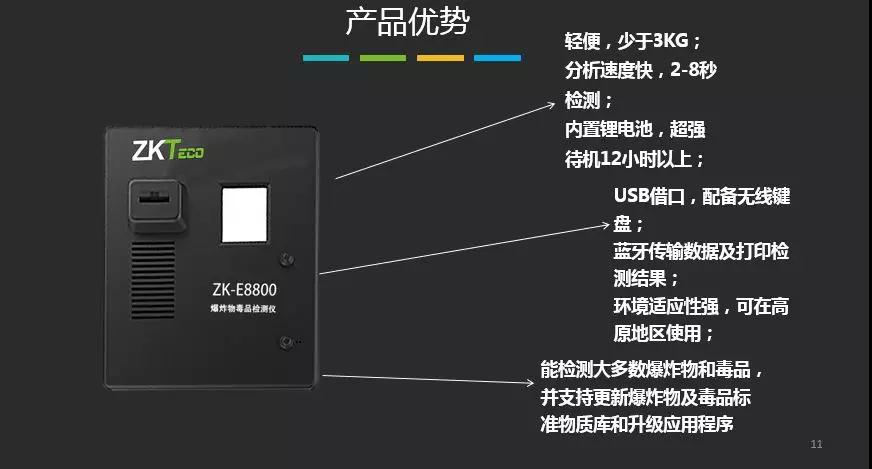 便攜式爆炸物毒品探測儀ZK-E8800是由中控門禁自主研發(fā)、生產(chǎn)的爆炸物和毒品檢查設(shè)備。該產(chǎn)品基于國際上先進(jìn)的離子遷移譜(IMS)技術(shù)原理,能夠快速、精準(zhǔn)地檢測并判斷痕量爆炸物及毒品的種類,具有快速、準(zhǔn)確地檢測痕量爆炸物、毒品的功能,產(chǎn)品性能達(dá)到同類產(chǎn)品國際先進(jìn)水平,具有易于使用,耗材成本低和維護(hù)方便等優(yōu)勢。
