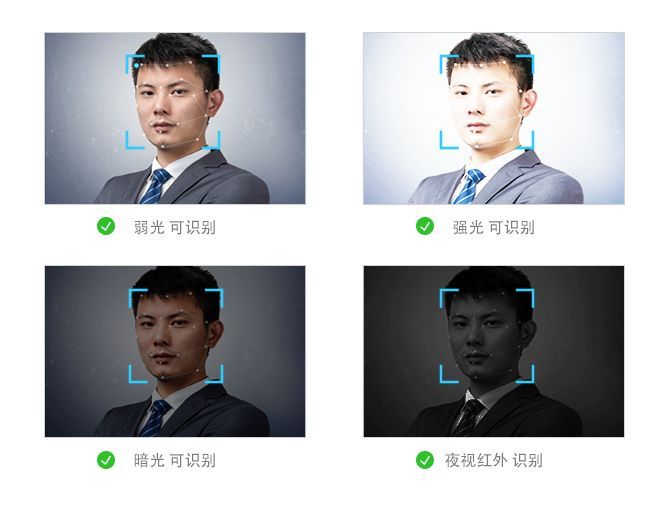 為了應付復雜的環境,采用的人臉識別技術一定要支持強光、弱光、黑夜背光等多種復雜環境,并且可以檢測出正臉、側臉等多
