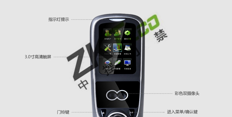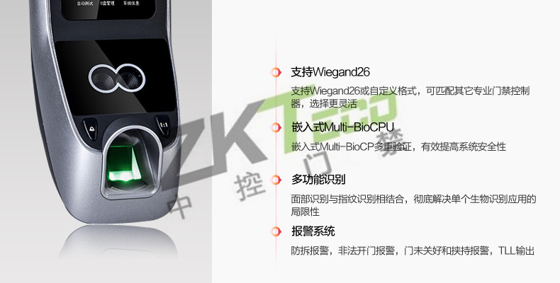 面部門禁一體機iFace7是基于ZEM800多媒體開發平臺設計的一款集指紋和面部混合驗證的3寸觸摸彩屏門禁終端,采用ZKFinger VX10.0最新指紋算法及ZKFace VX7.0面部算法,識別速度快,靈活選擇面部、指紋或者密碼開門方式,集成高分辨率夜市紅外和雙攝像頭功能,適應范圍廣。支持高級門禁功能(不同時間段開門,多人開門,拆機報警,門未關好報警,門被非法打開報警,開門按鈕輸入,有限門鈴接口,脅迫報警等)。標配的TCP/IP通訊,支持跨網段跨網關連接,是安防工程的首先產品,可用于銀行、部隊、機場等高安全場所。